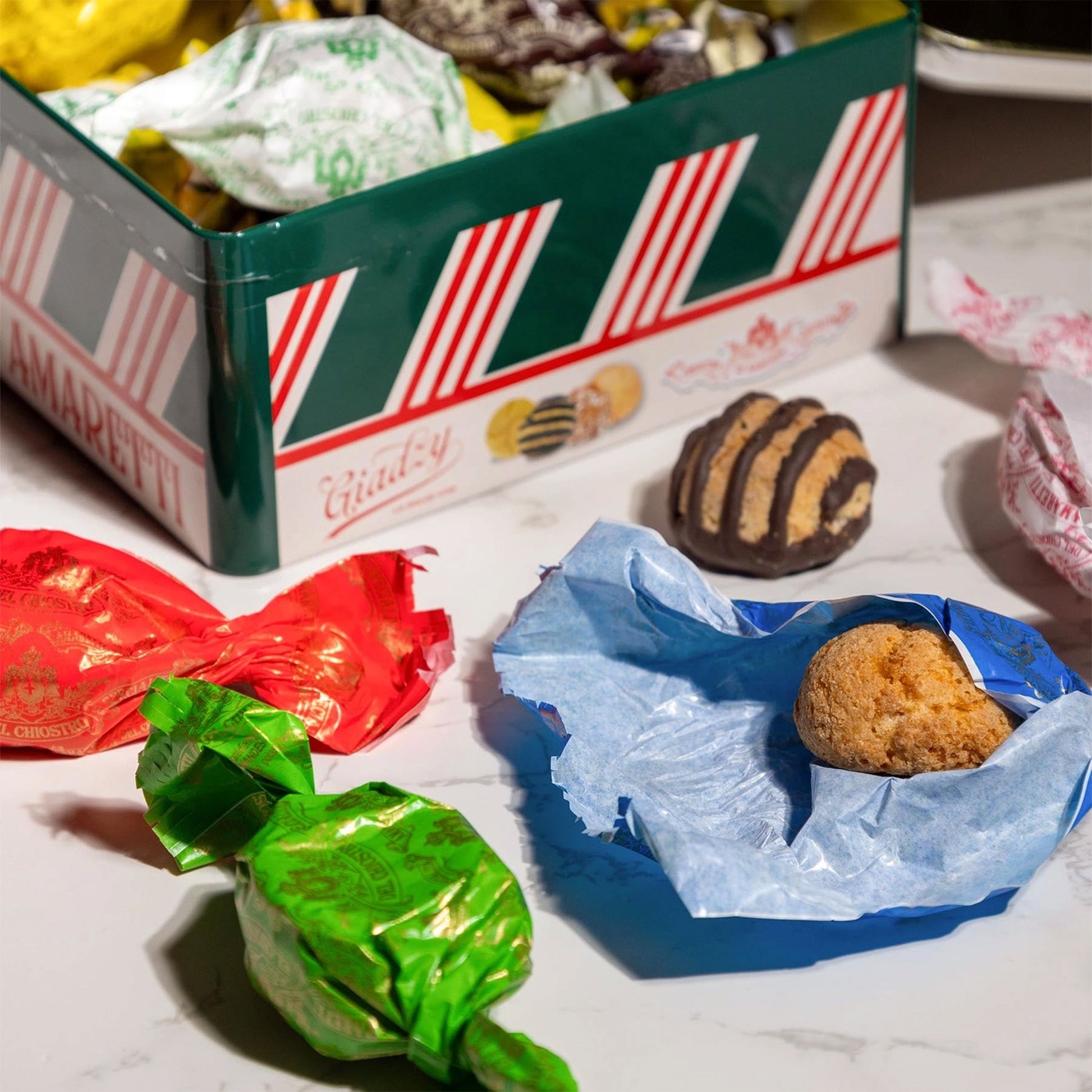 We fell for the tin but stayed for the cookies! This little box contains an assortment our favorite cookies from Chiostro di Saronno (the northern Italian original makers of amaretti): classic crunchy amaretti, soft amaretti, chocolate-covered amaretti, and fragrant lemon amaretti.