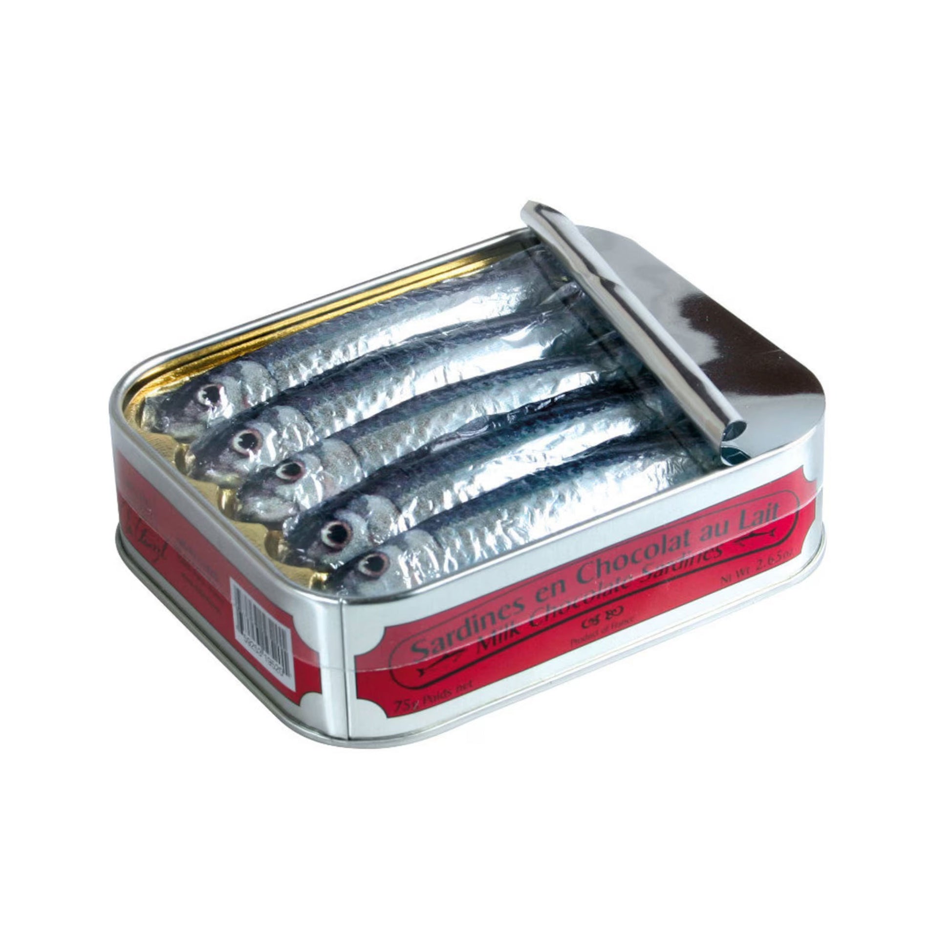 A delightful play on a tin of sardines — these five milk-chocolate molded sardines come in a tin-like box and look about as cute as a chocolate fish can. 39% milk chocolate makes a creamy smooth treat. But really, it's the presentation we're going for. We're smitten, hook, line, and sinker.