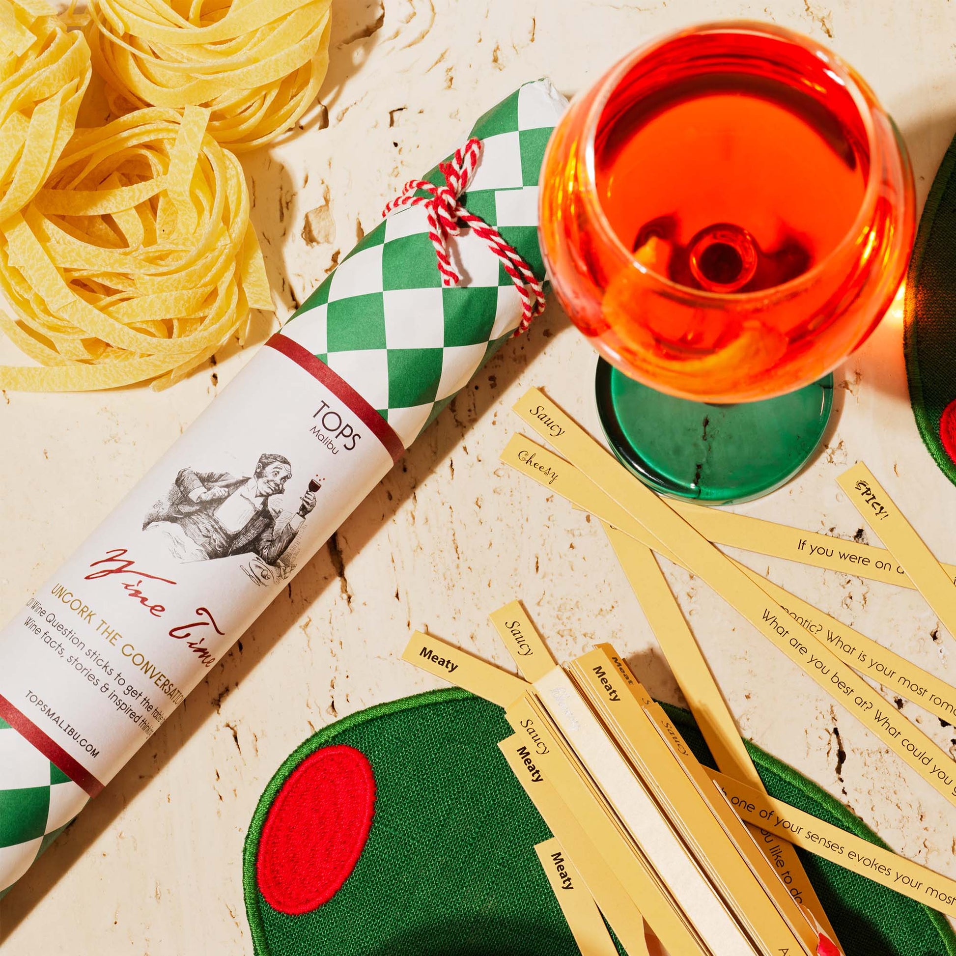 A conversation game with 108 question sticks, each posing a bold-and-juicy question and wine facts to get things going — because a little kitsch always lends itself to a good time. Questions come in a bold, checkerboard wrapping perfect for gifts and hostess presents. (Pair with Paradise Found and Bilboquet Wine Glasses for a themed trio.)