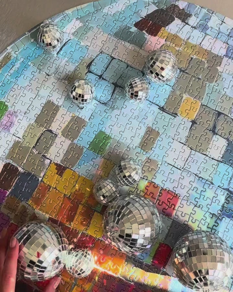 Meet Disco Puzzle — a round, 750-piece puzzle featuring a prismatic painting by artist Ashley Treece. Finished with a holographic sheen that mirrors the shimmer of a real disco ball.