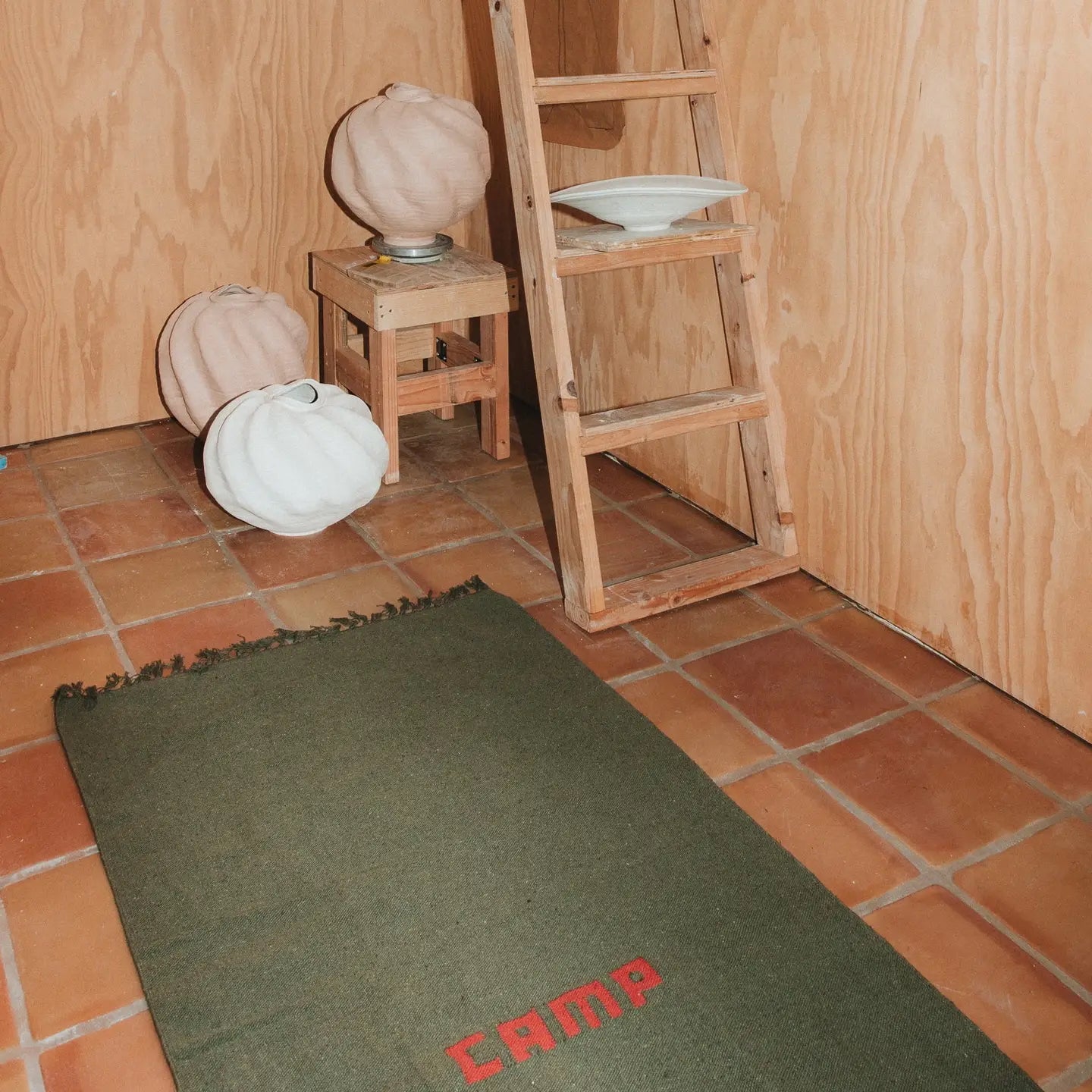 Built for campfires, cabins, and couch forts alike. Hand-loomed from recycled yarn in a deep forest green and stamped with a bold red “CAMP,” this rug is equal parts nostalgic and utilitarian. It’s sturdy enough for the outdoors, soft enough for living room lounging, and charming enough to inspire ghost stories even in broad daylight.