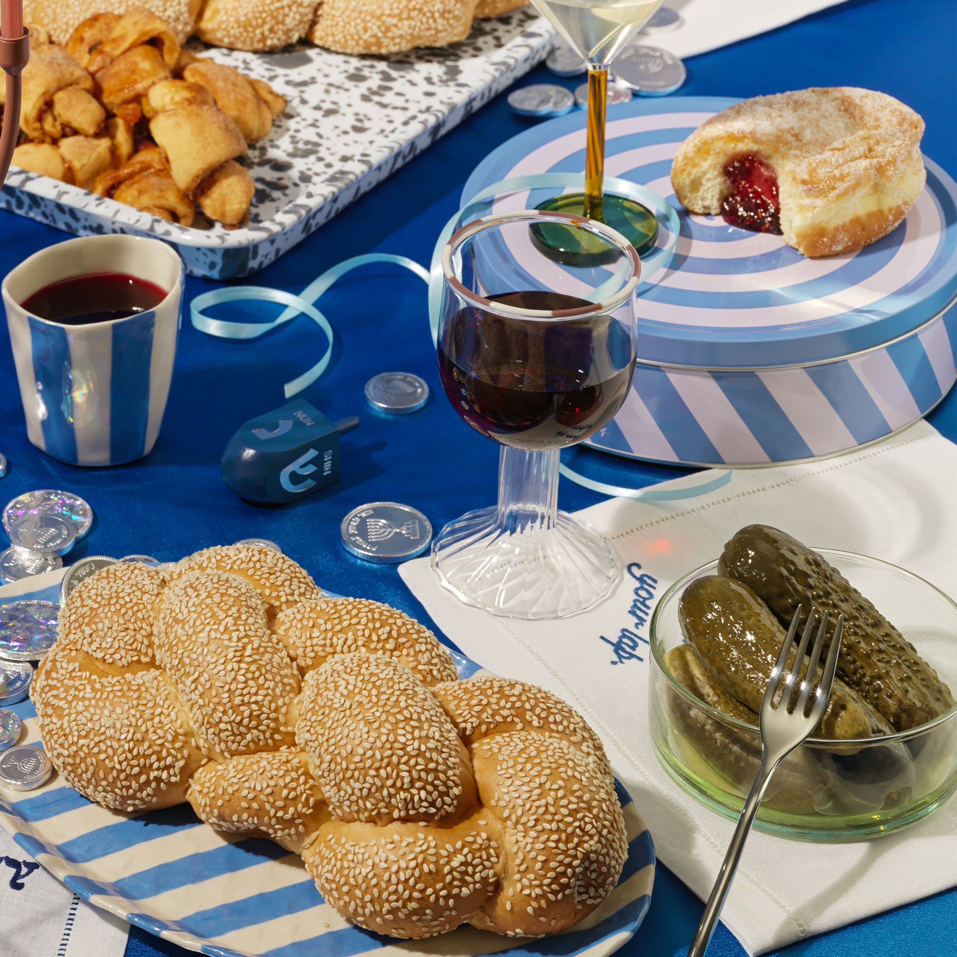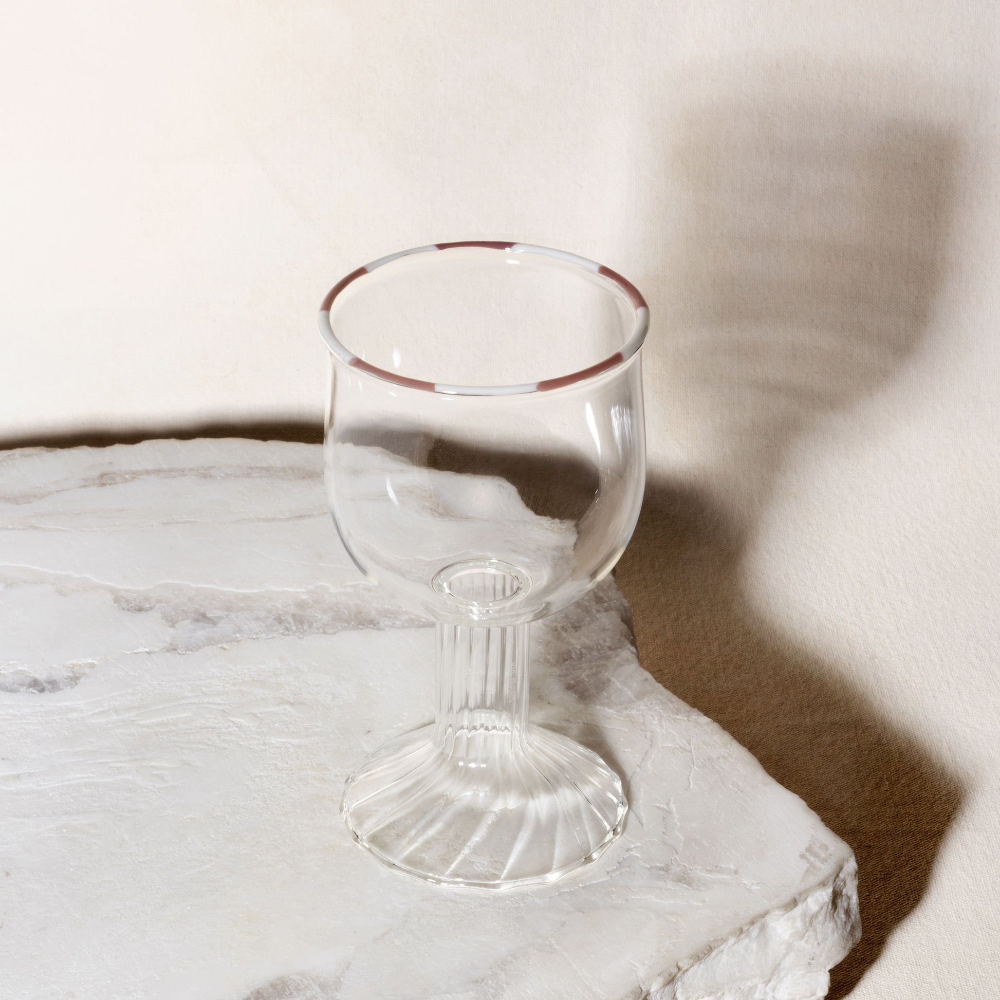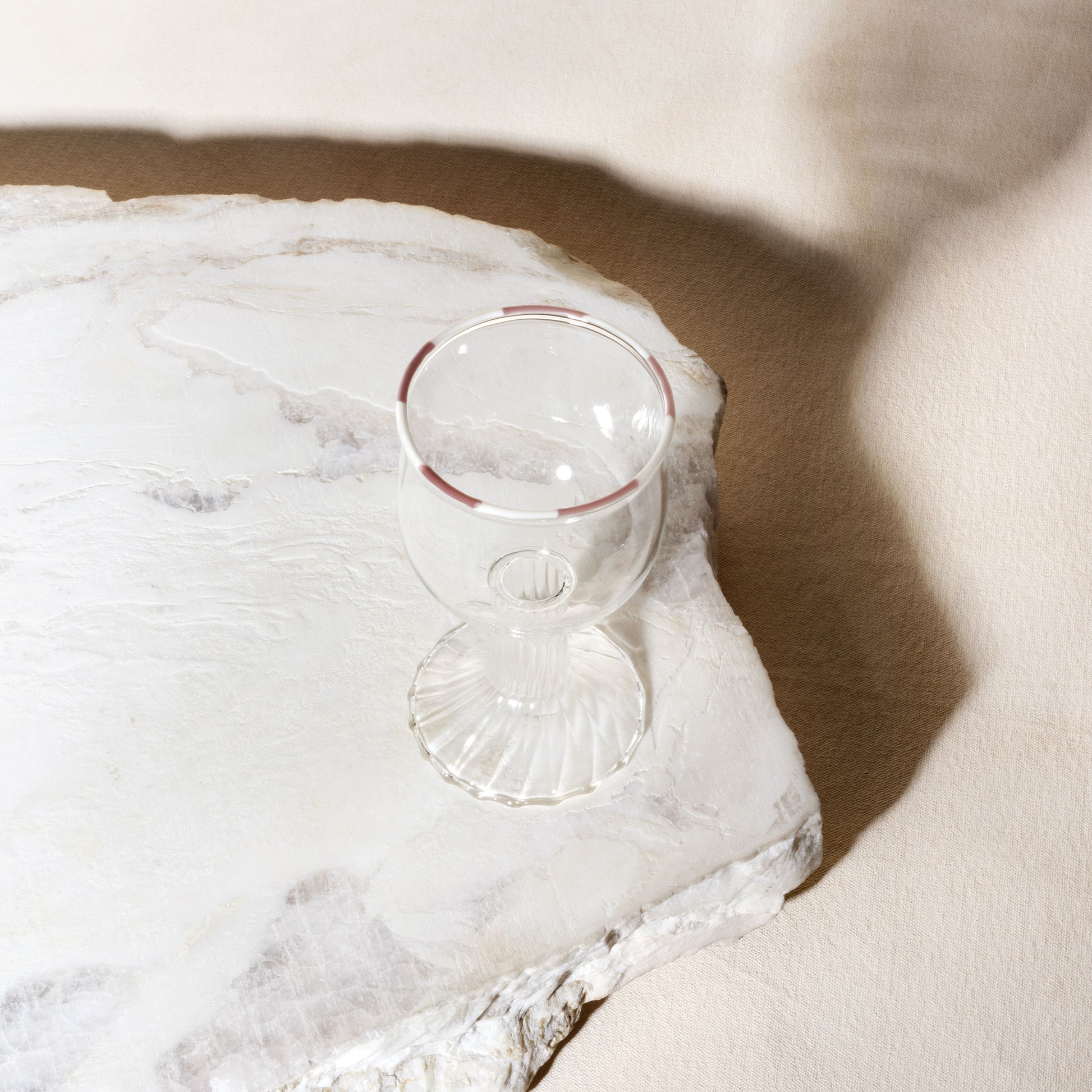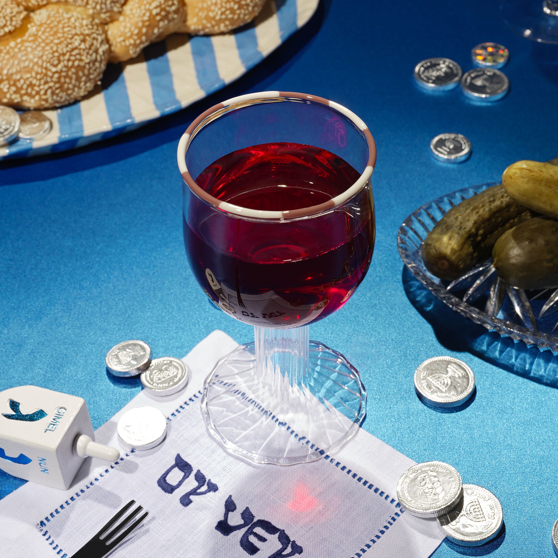 Made from borosilicate glass, this modern take on a Kiddush cup is carefully sculpted through flamework with a textured stem and a minimalist color pattern rim. Not only does it look stunning on a dining table, it works beautifully for the blessing of the wine, and the drinking of it, too.
