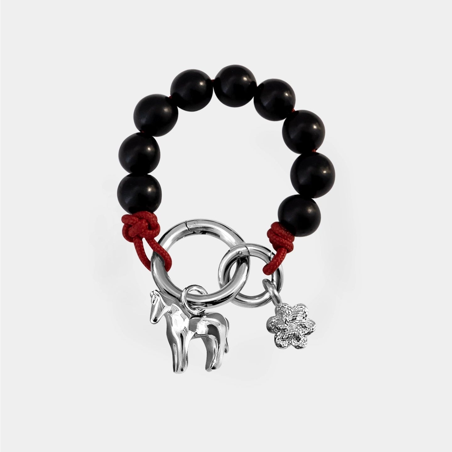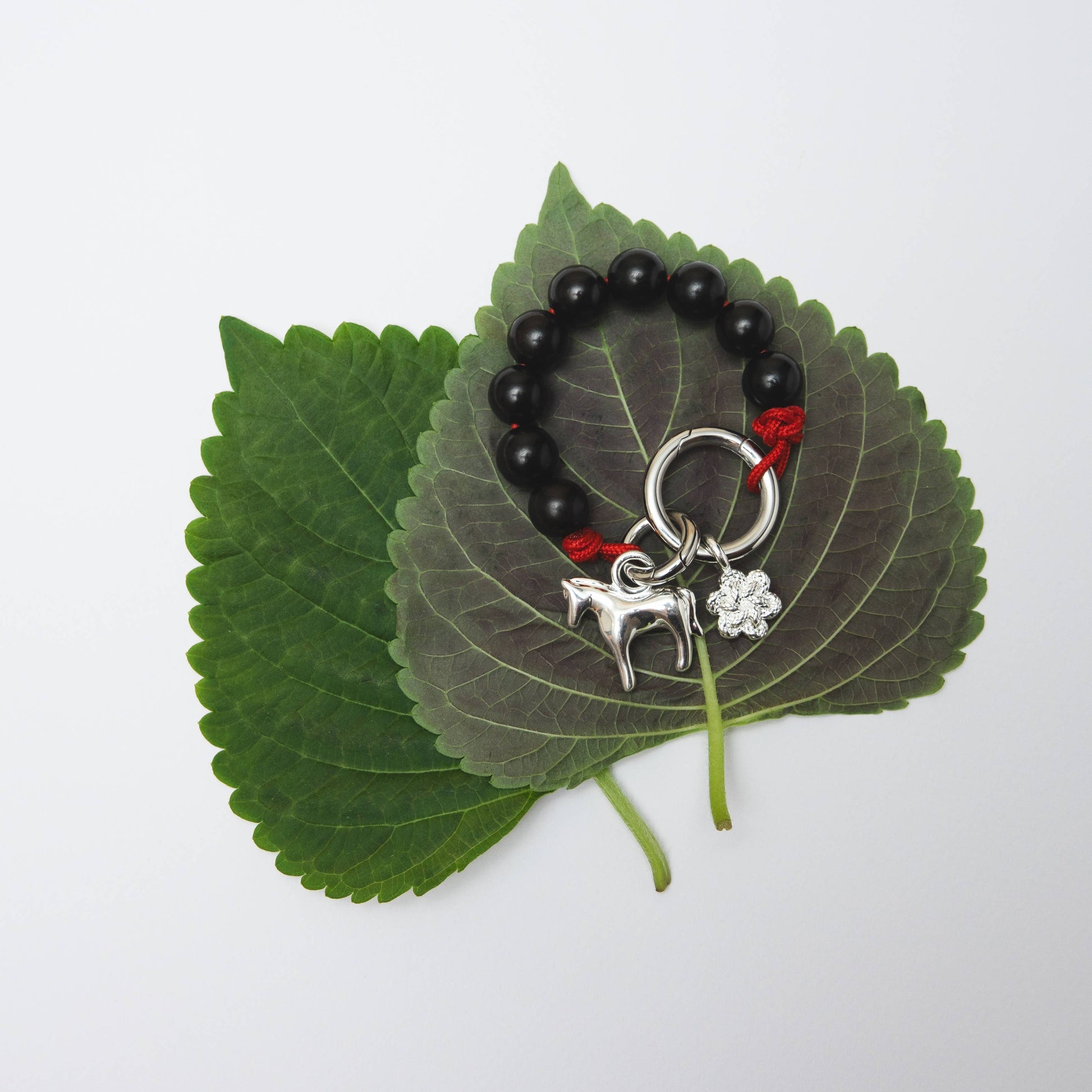 - Materials: Stainless steel hinged O-Rings, sterling silver plated brass horse charm, braided paracord, natural agarwood beads