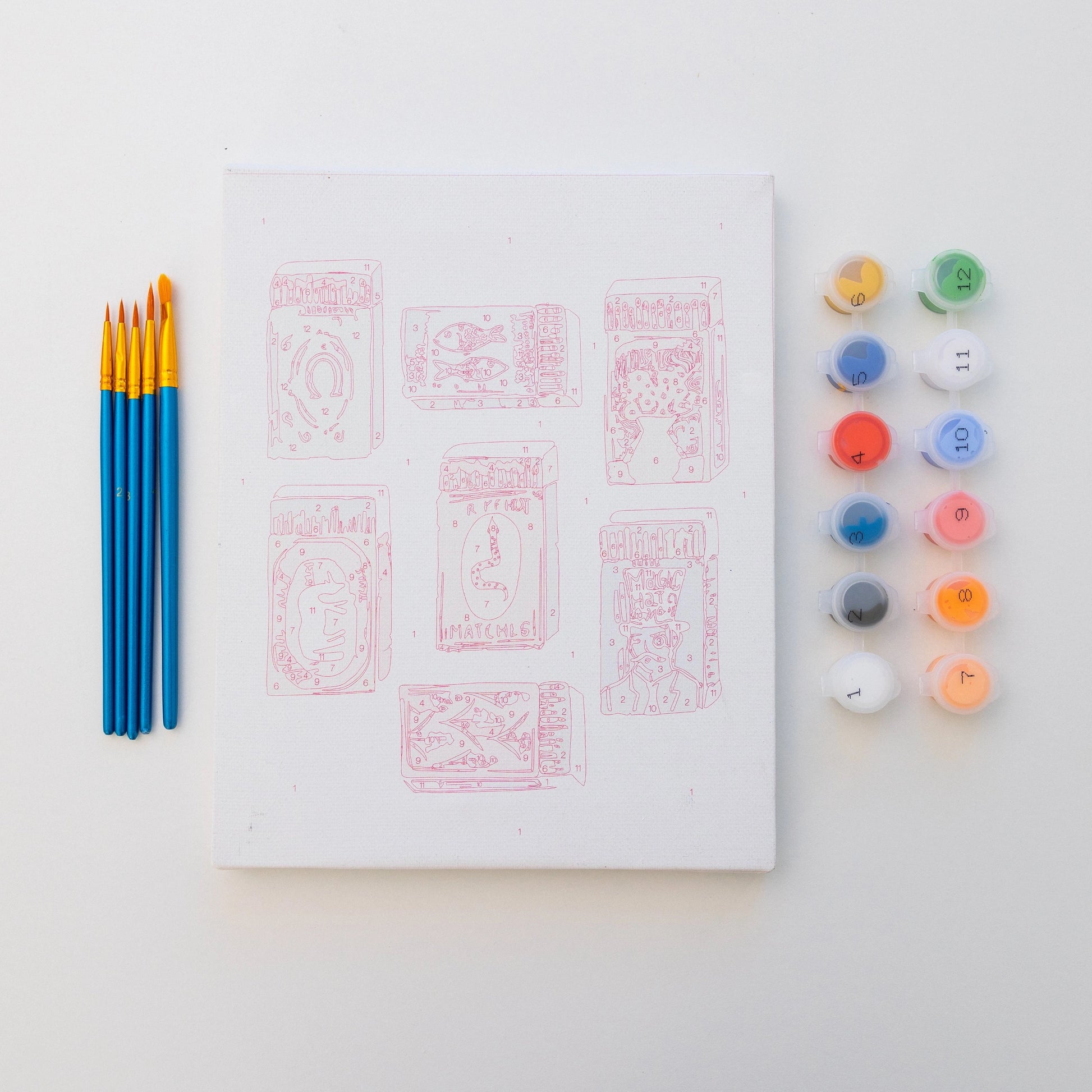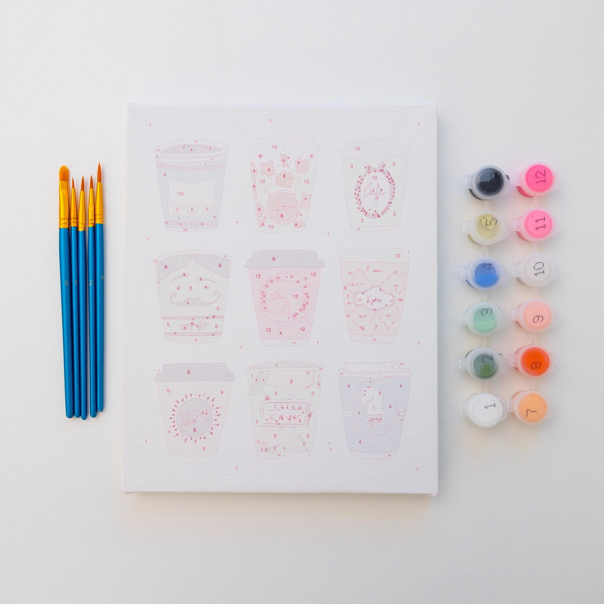 - Each kit includes a a 8" x 10" stretched printed canvas, a set of 5 premium brushes, and 12 pots of acrylic paint with the appropriate colors with corresponding numbers
