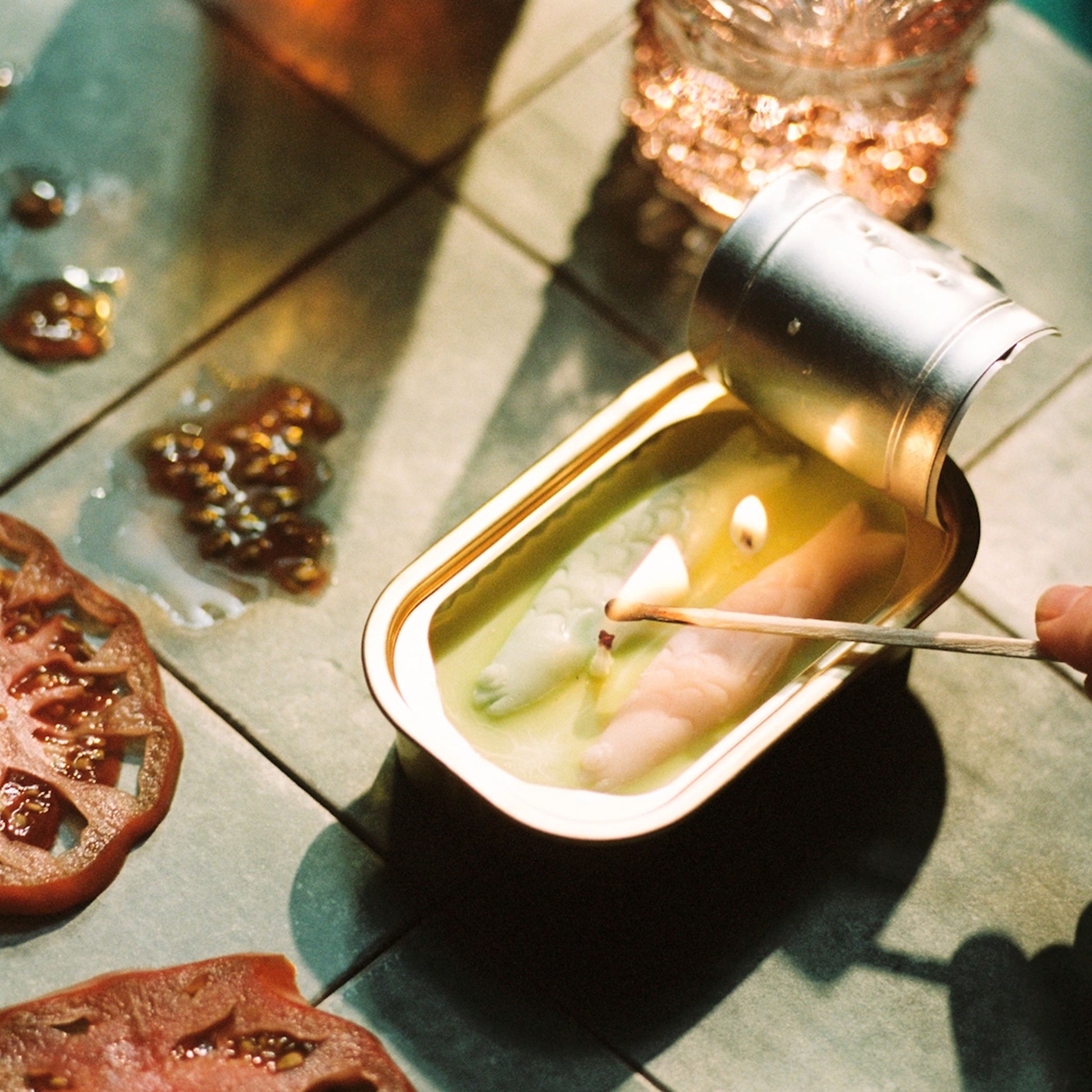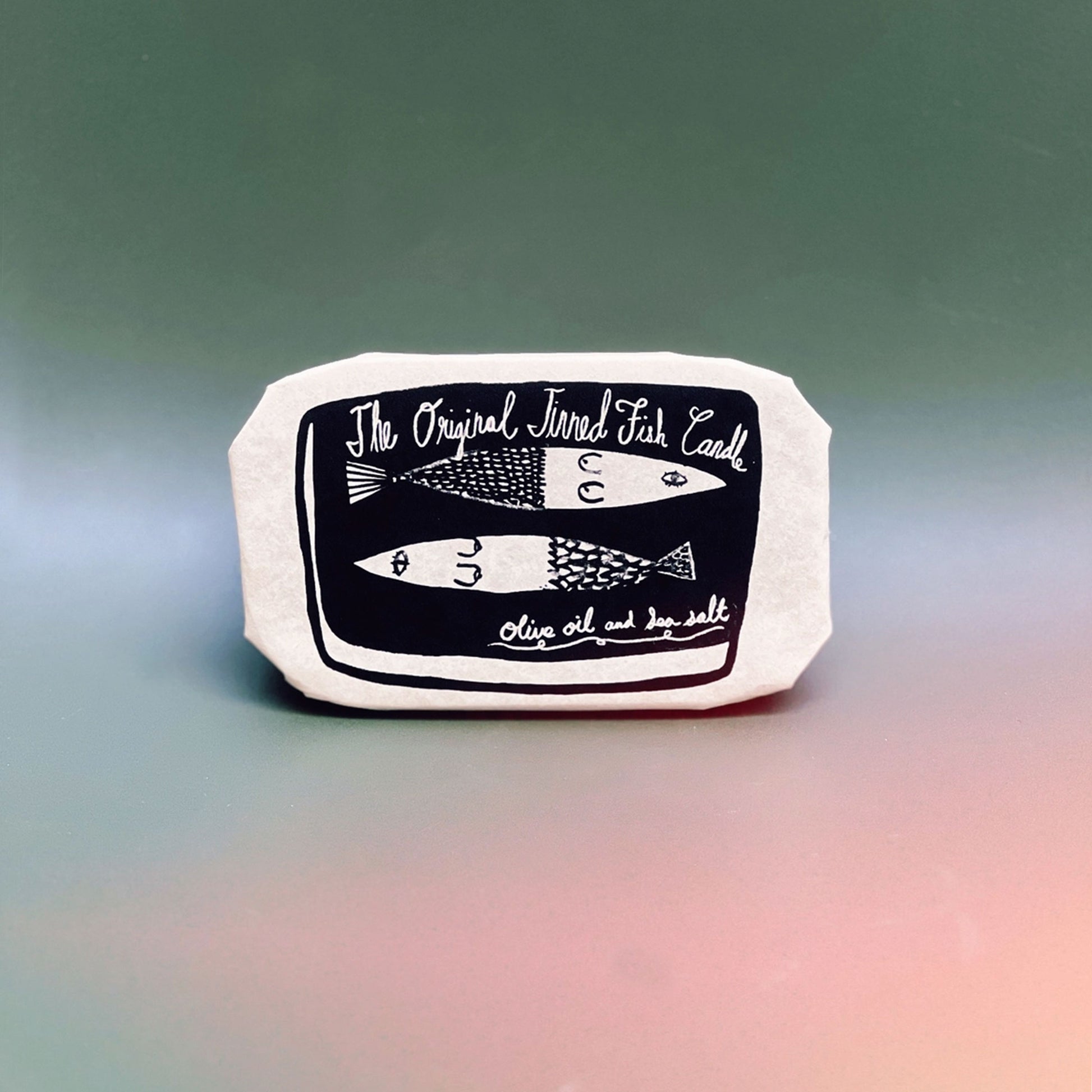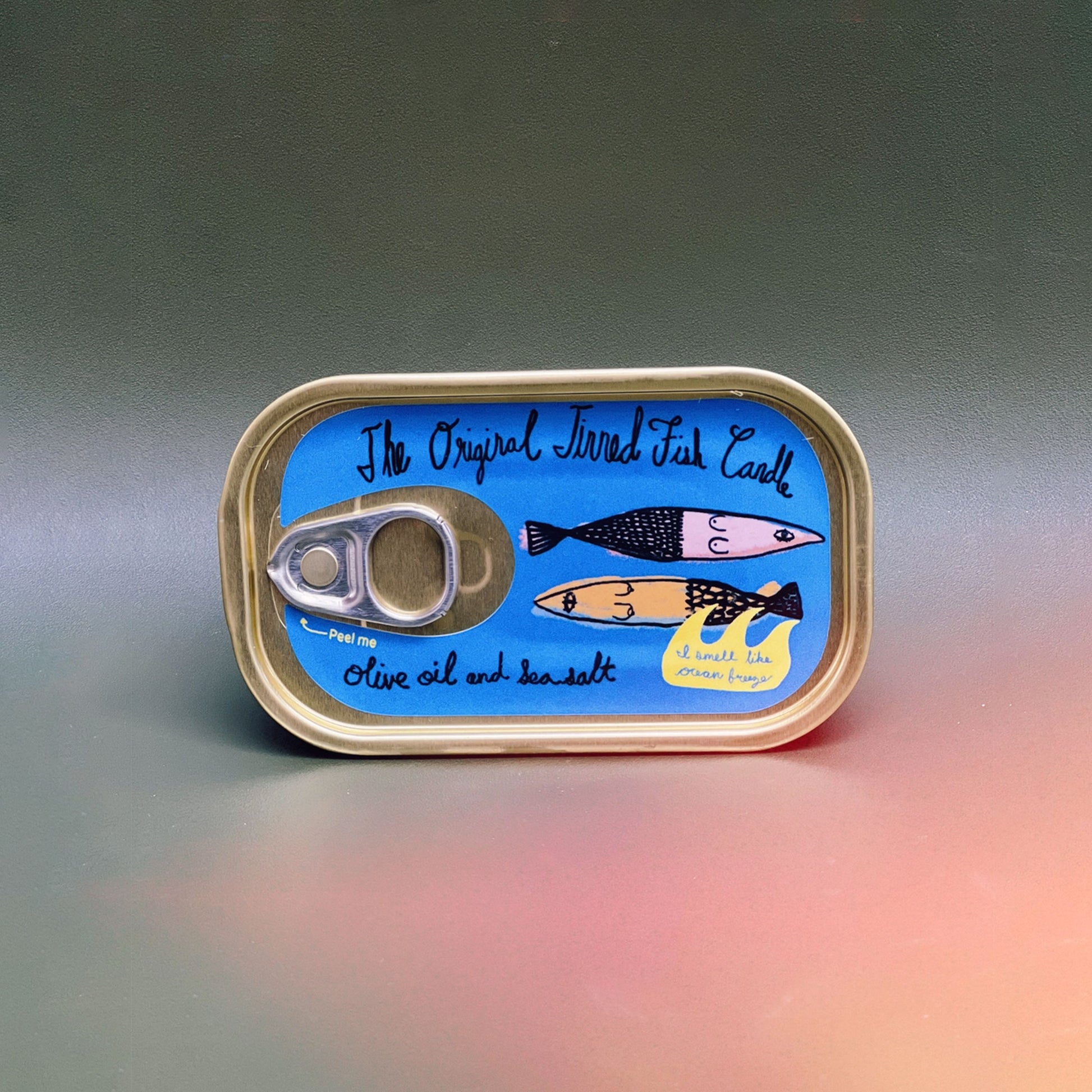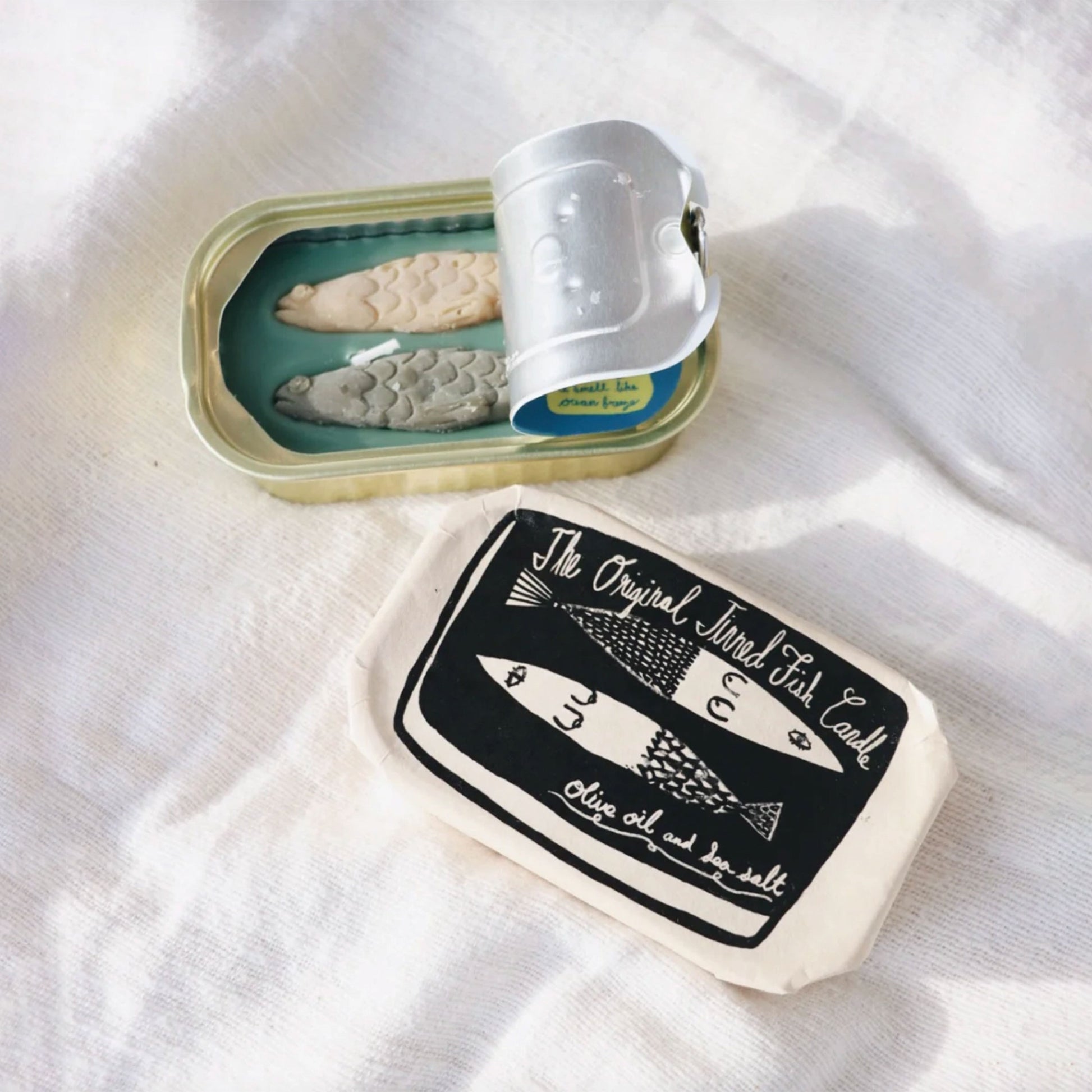 This delightful premium soy wax candle mimics a sardine can: peel back the tin lid to reveal a whimsical scene reminiscent of actual sardines (with a different smell of course— think sea salt and tranquility.)