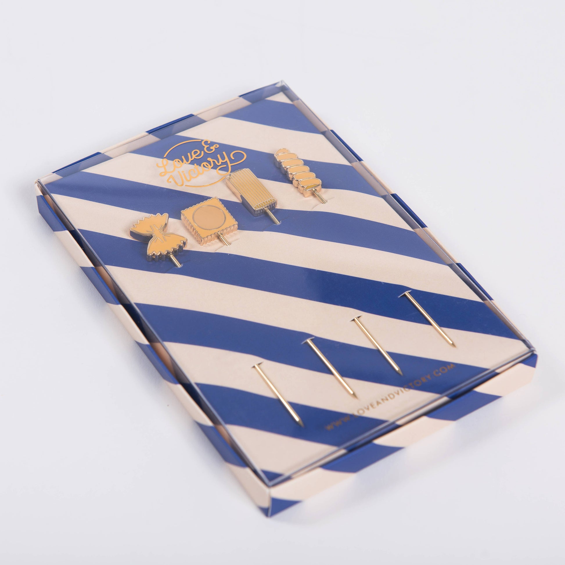 Aperitivo hour just got al dente. This set of four gold cocktail picks is topped with enamel pasta shapes— farfalle, ravioli, rigatoni, fusilli— AKA the cutest garnish accoutrements you’ve ever met. Perfect for martinis, spritzes, and any drink that deserves a little pasta energy. Packaged in a bold, giftable box.