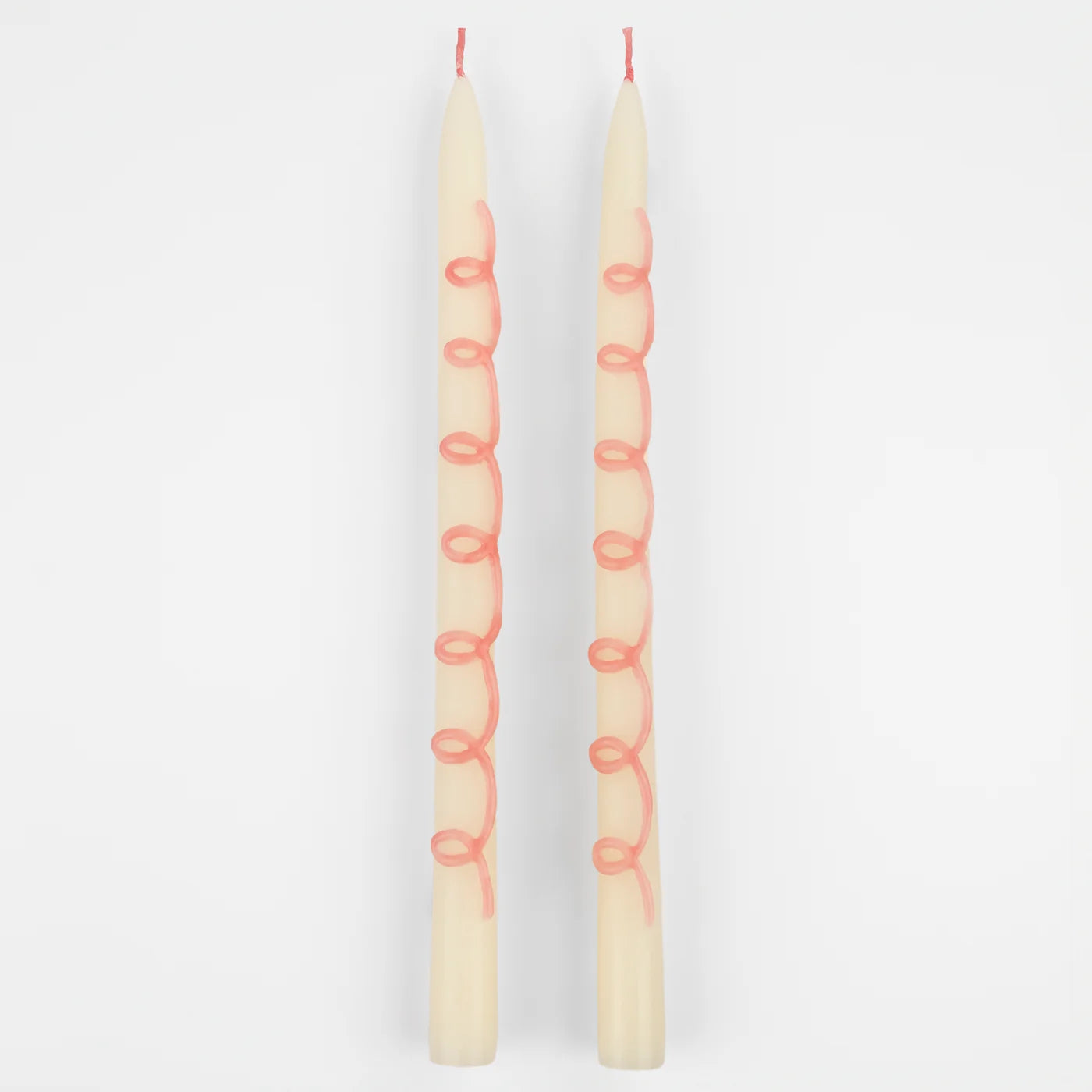 Tapered, twisted, and finished with a pop of pink. These swirl candles come with a surprise detail—pink wicks—for an extra hit of charm. Perfect for dressing up tables, mantels, or any gathering that could use a little more color (and a lot more fun).