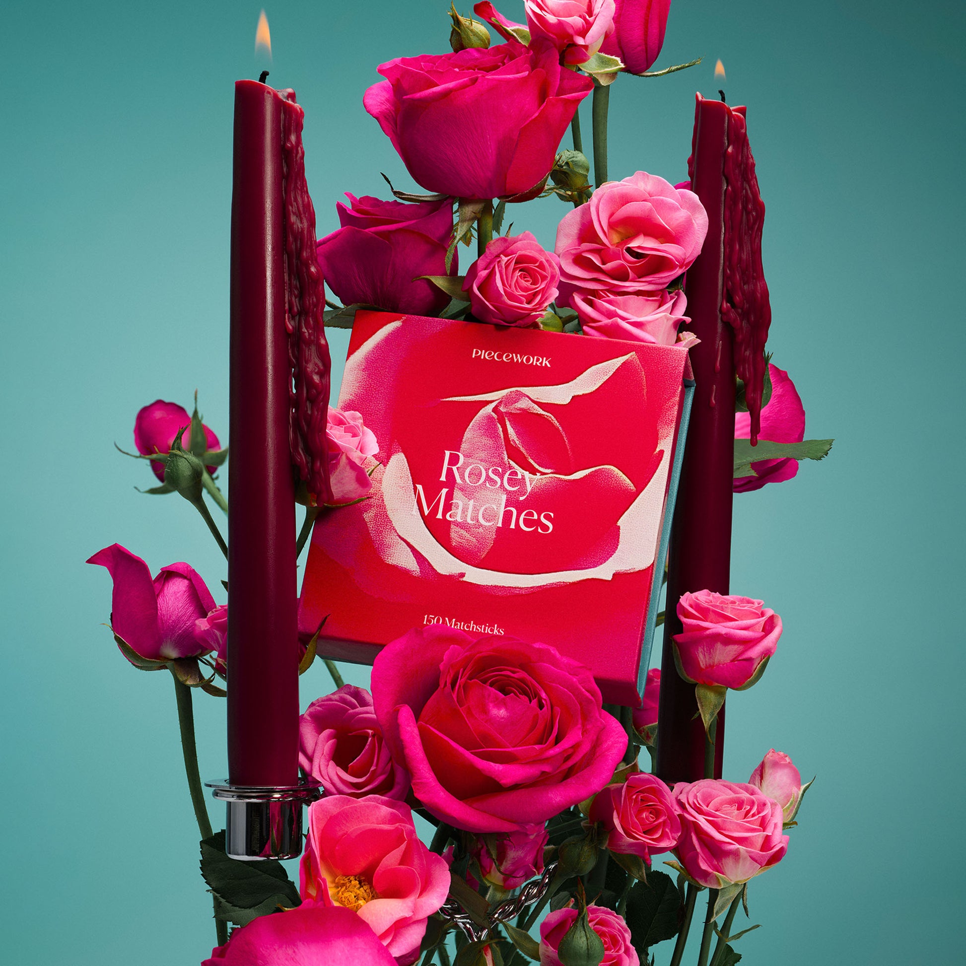 A bouquet in a matchbox. Rosey Matches are a premium set of matches in lush, petal-pink with green stems—designed to look as fresh as a just-picked rose.