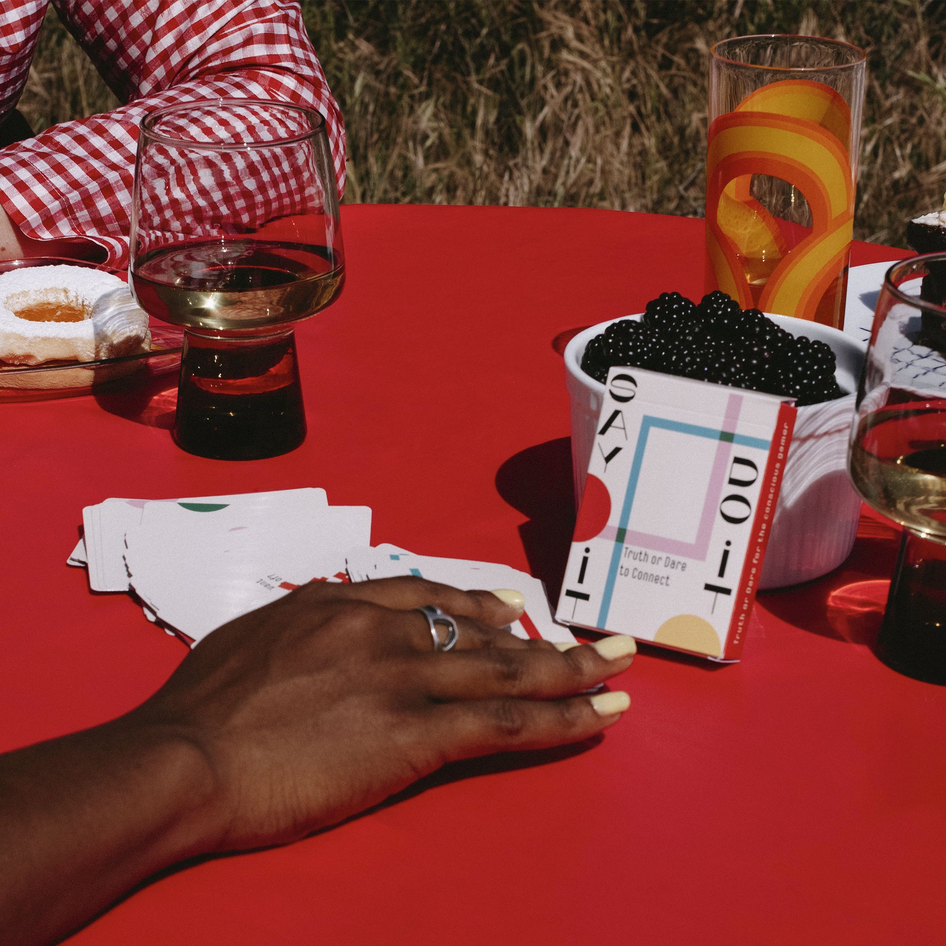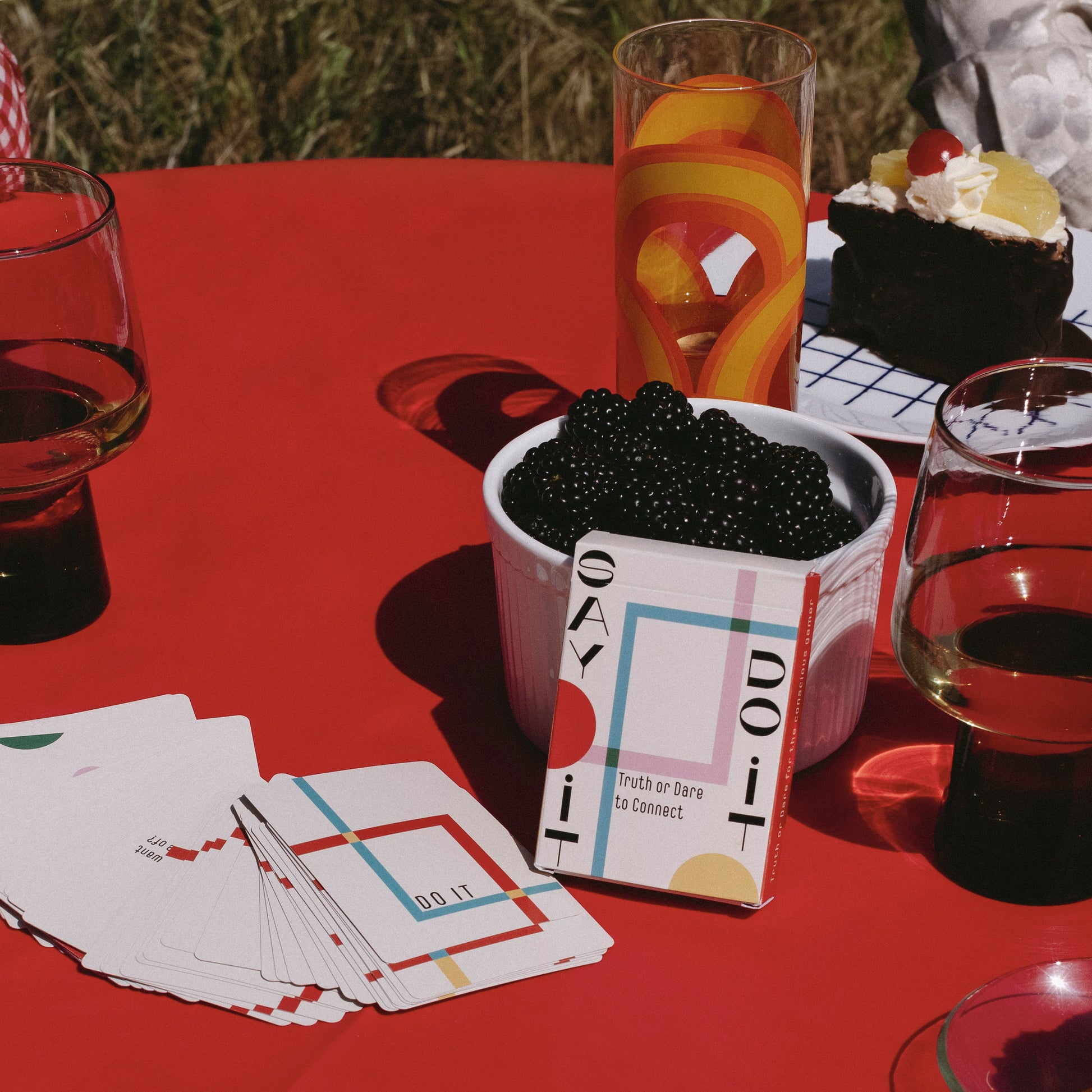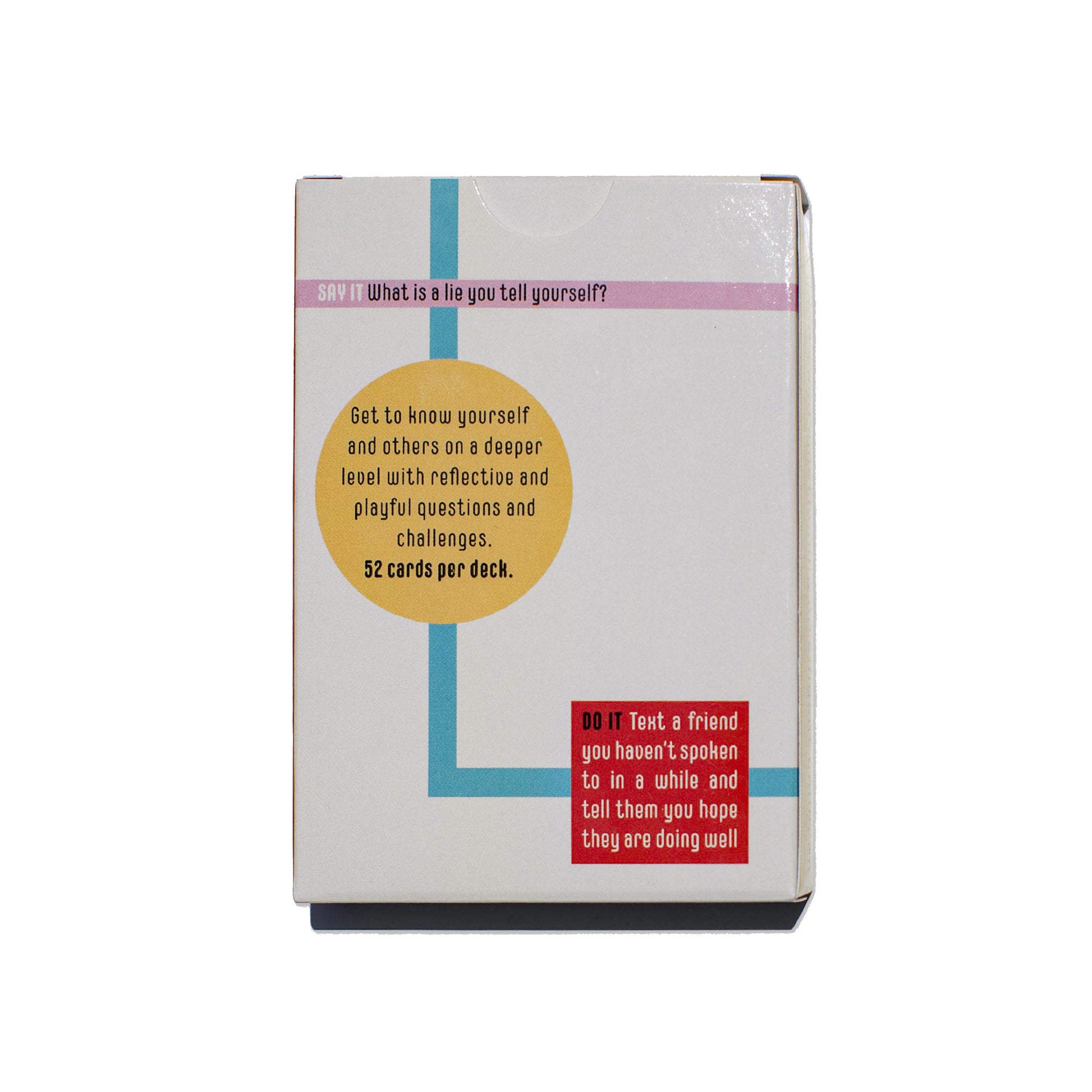 Get to know yourself and others on a deeper level with reflective and playful questions and challenges. 54 cards per deck: 26 “say its” and 26 “do its,” instructions and surprise card. “Say its” are truth cards and “Do its” are dare cards.