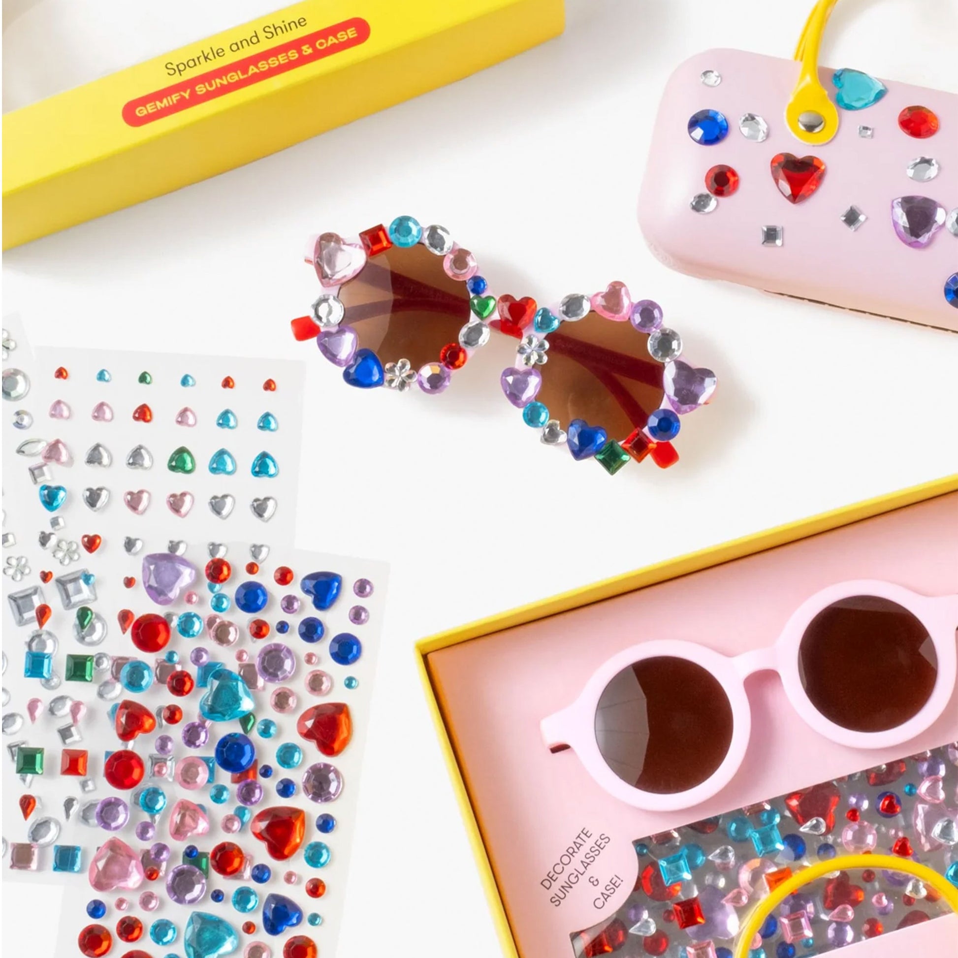 A kit featuring sunglasses and carrying case ready to be "gemified" with 100+ gem stickers. An art-and-accessory kit in one!