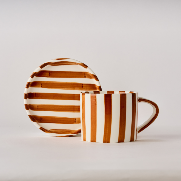 Bold stripes meet quiet ritual in this hand-painted mug and saucer duo — a modern twist on the classic coffee set. Perfect for espresso, tea, or something sweet after dinner, it brings color, pattern, and a touch of café flair to your everyday routine.