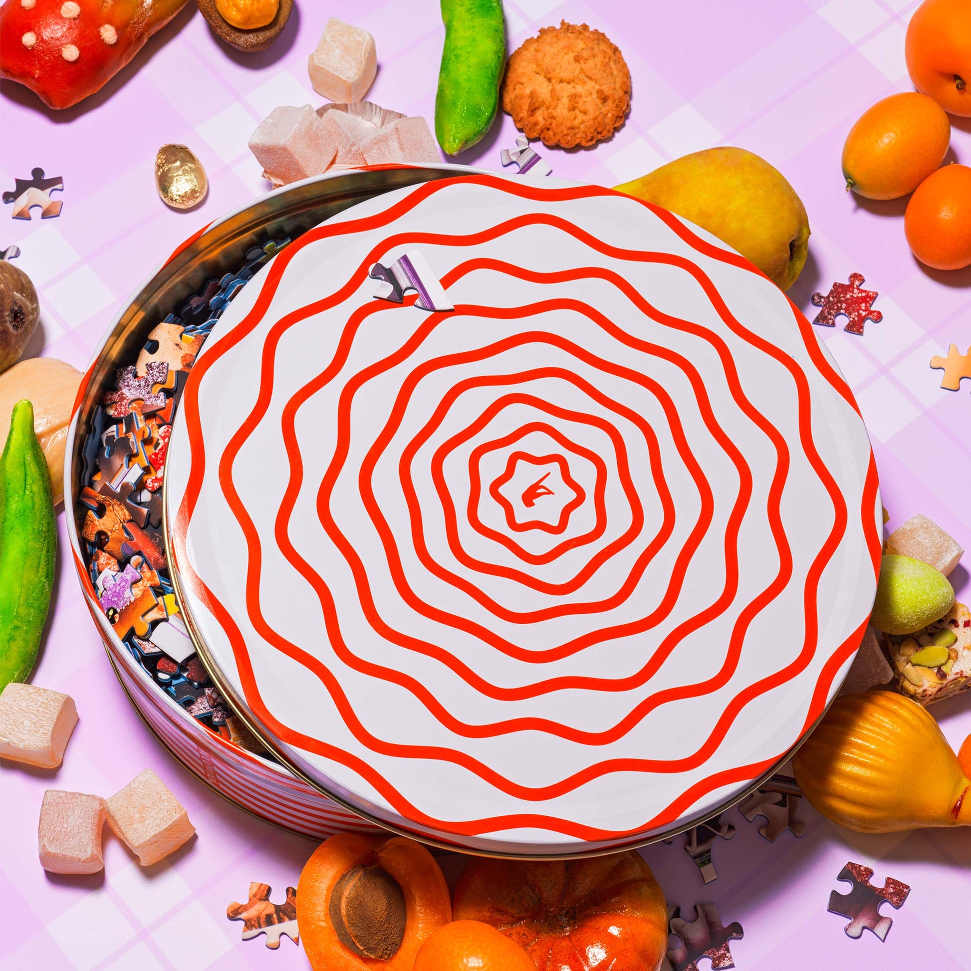 Sugared plums and marzipan delights. Gold-foiled almonds and delectable treats. This round puzzle features an overflowing array of holiday candies and comes in a limited-edition collectible wavy-striped tin — a gift that keeps on giving.