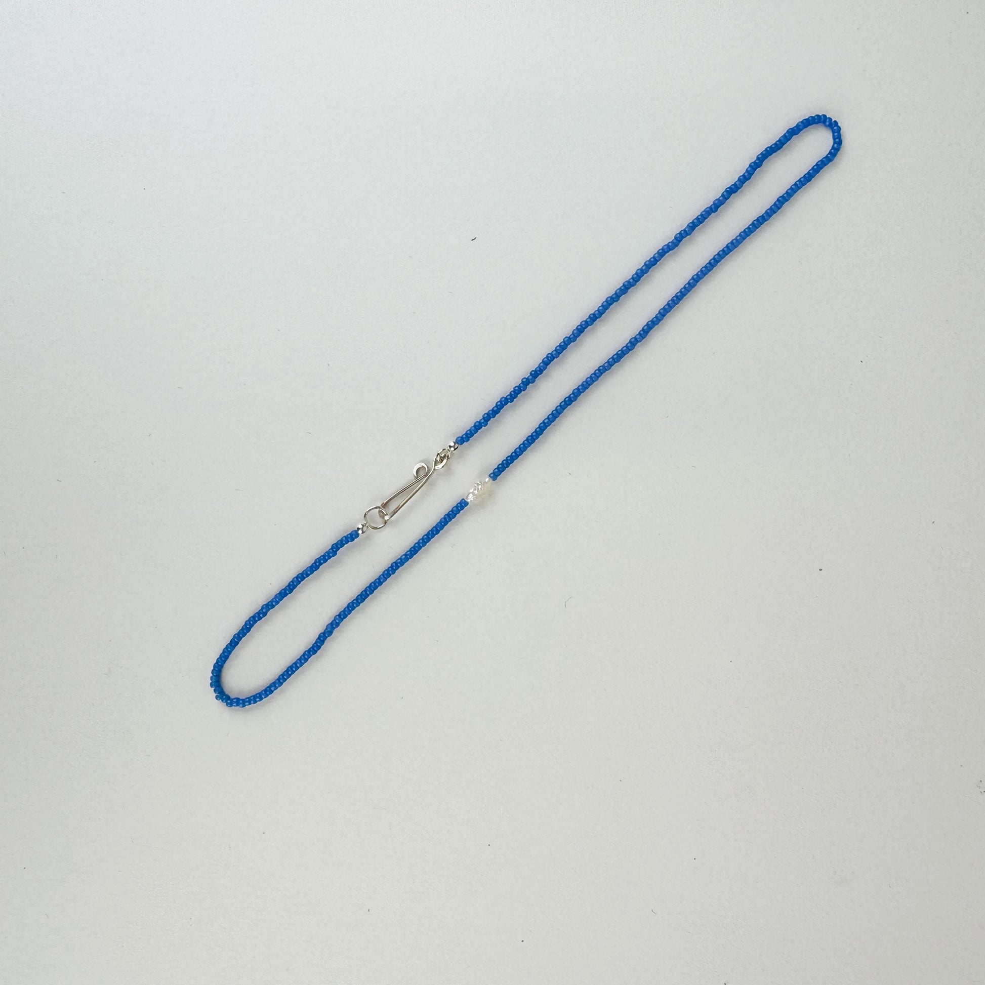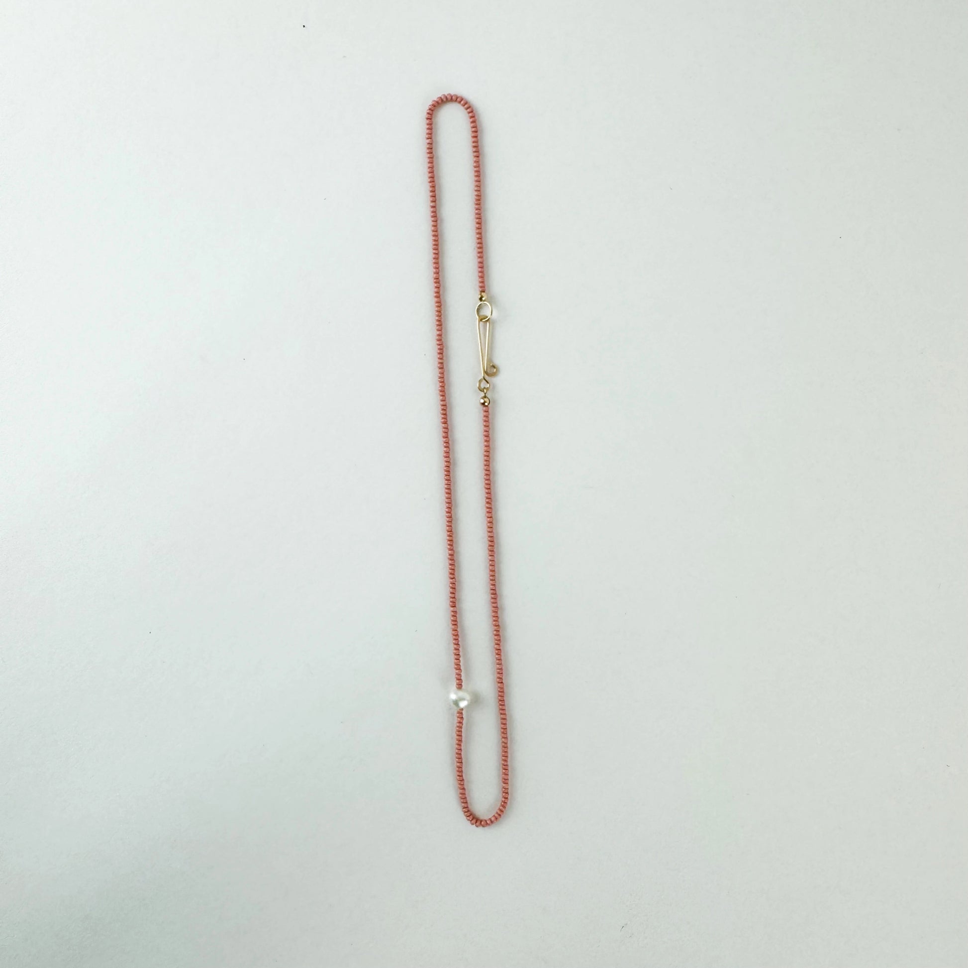 - Materials: A single freshwater pearl strung with silk and offset by seed beads.